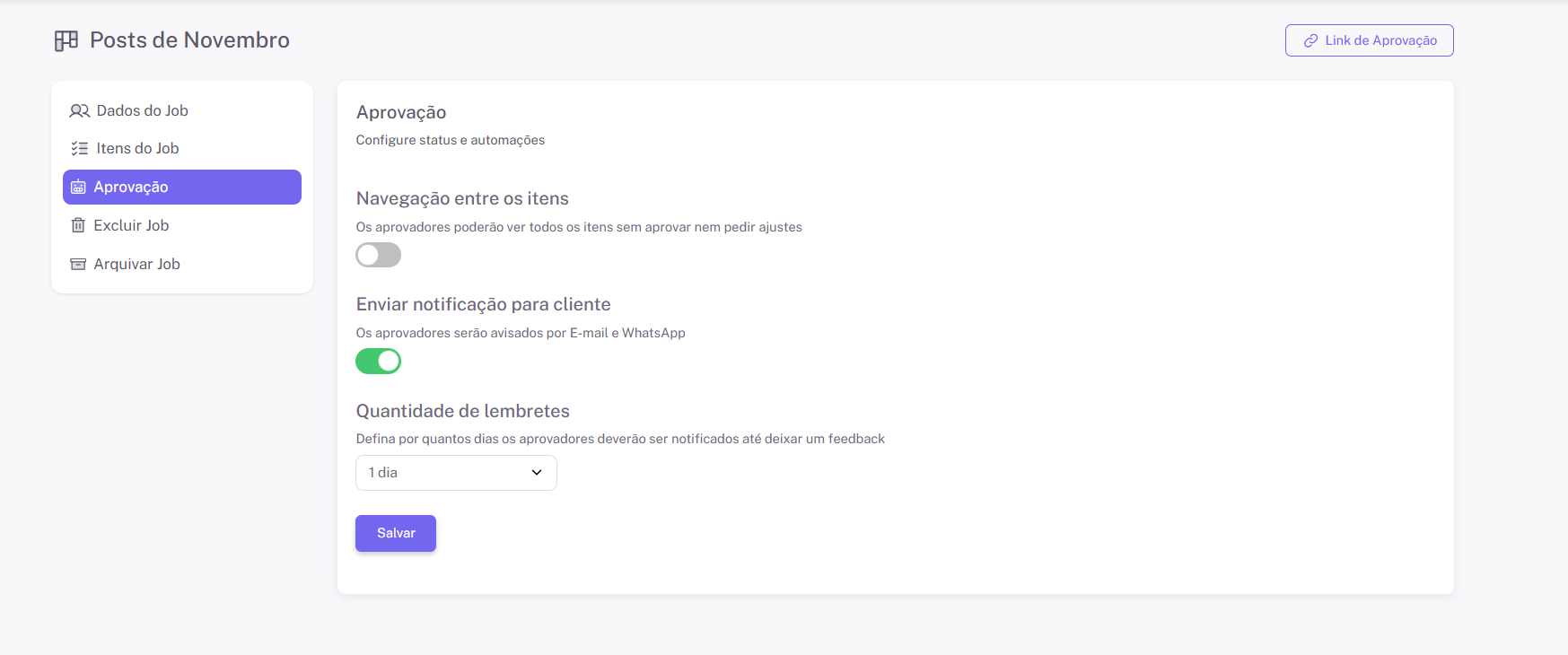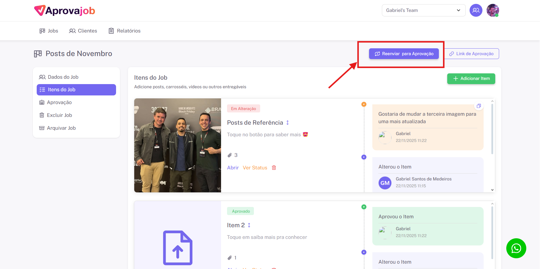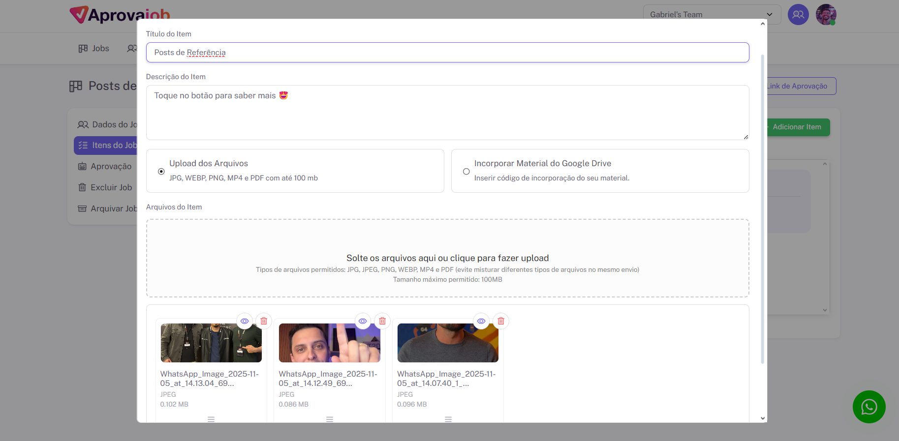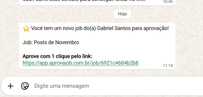 Pronto! O job está oficialmente em aprovação e o cliente recebe imediatamente o link por WhatsApp.