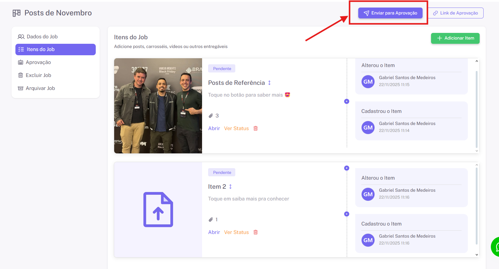Cada item tem seu próprio status, independente do status geral do job. Isso significa que um job pode estar, por exemplo, Em Aprovação, enquanto dentro dele: