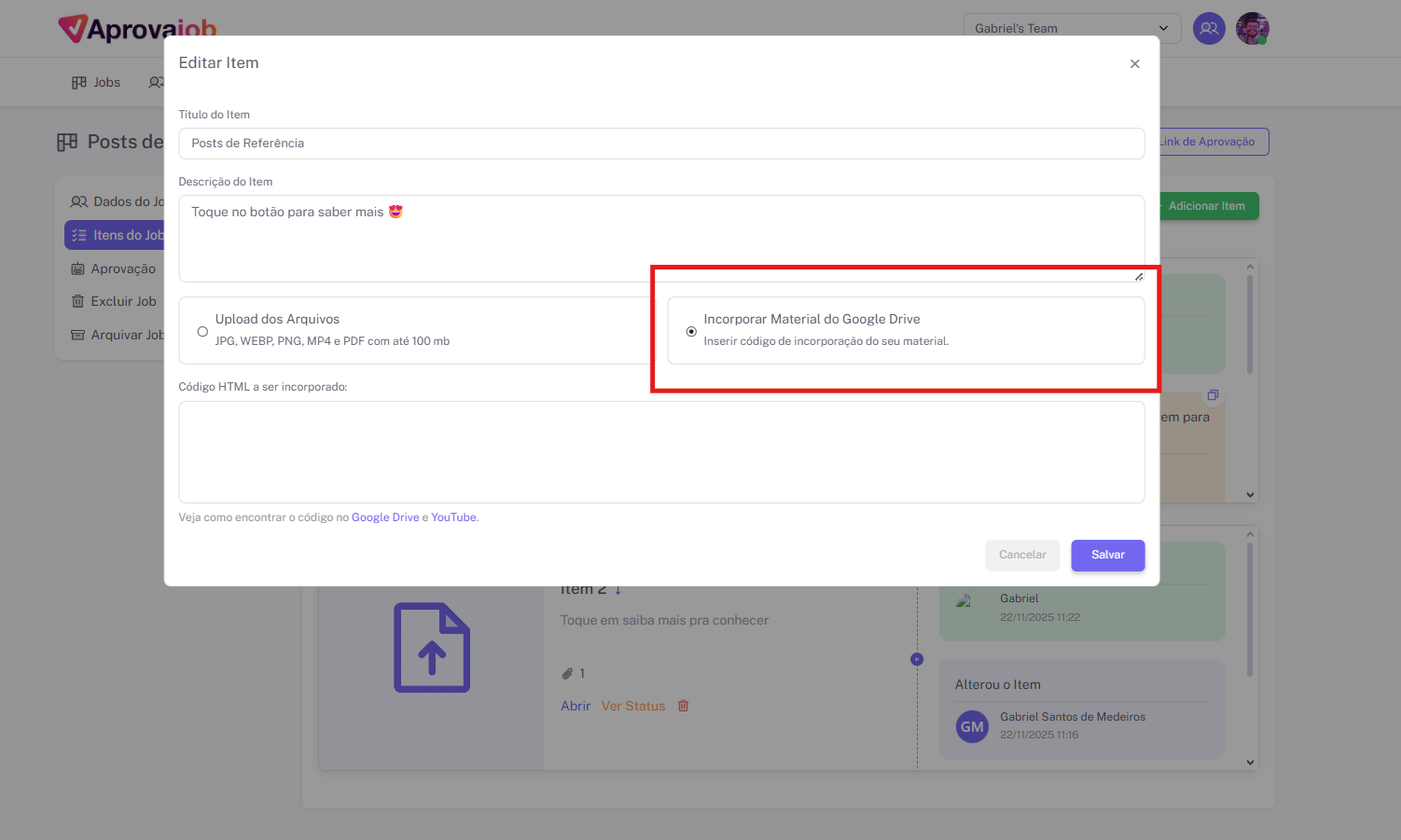 Dentro do Aprovajob, um job é o pacote geral que você envia para aprovação, e os itens são as peças individuais dentro desse pacote.