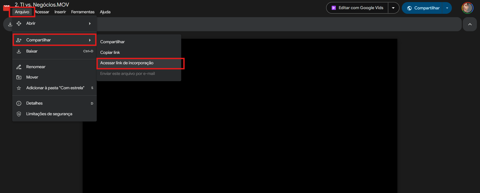 3. Clique Arquivo > Compartilhar > Acessar Link de Incorporação